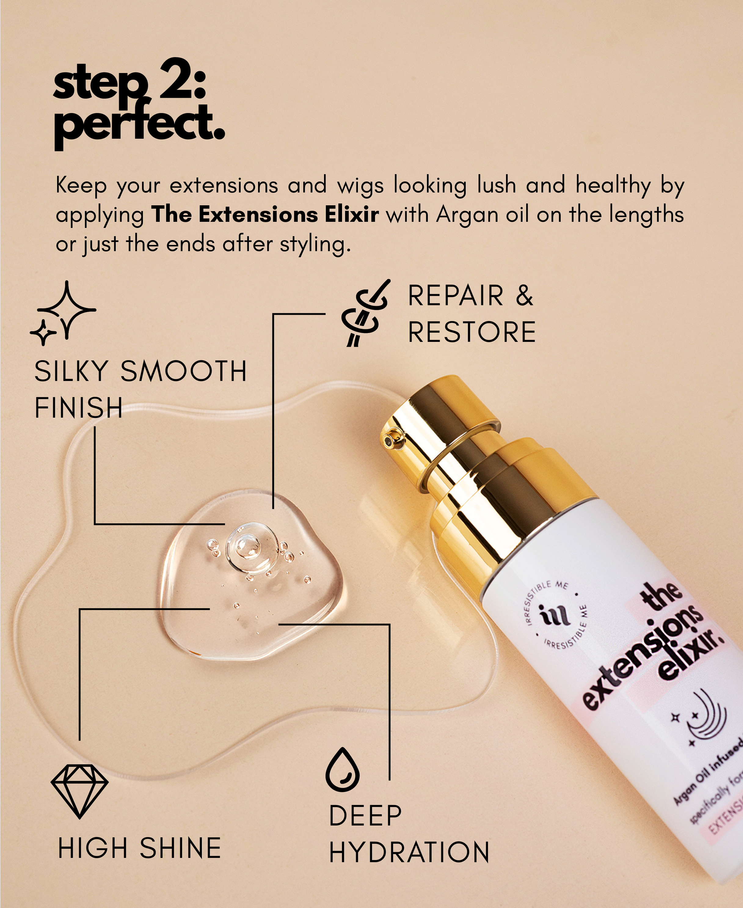 - Step 2: Perfect. Keep your extensions and wigs looking lush and healthy by applying The Extensions Elixir with Argan oil on the lengths or just the ends after styling.